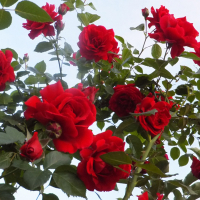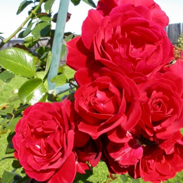 Роза Симпаті (Sympathie) - дуже ефектна квітуча троянда яскраво-червоного кольору. Чудово виглядає на арці або перголі, відмінно підійде для вертикального озеленення. Квітки досить великі (9-10 см) келихоподібної форми, як у чайно-гібридних троянд, зібрані в суцвіття по 3-10 шт, пелюстки червоні з малиновим відливом, здаються бархатистими. Аромат ніжний, ненав'язливий. Перша хвиля цвітіння найрясніша, потім троянда цвіте повторно, вже менш рясно. Кущ висотою 300-350 см, гіллястий з блискучим яскраво-зеленим листям. Стійкість до захворювань відмінна. Витримує морози до -26 °С