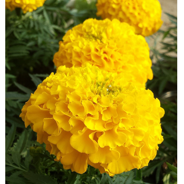 Тагетіс крупноквітковий, відомий також як чорнобривці - характеризується не високим зростом 20-30 см і великою квіткою до 8 см в діаметрі. Рослині властивий специфічний запах. Росте швидко, що робить його особливо бажаним за умов короткого літа. Цвітіння починається з липня і продовжується до глибокої осені. Листя перисто-розсічене матове, світло-зеленого кольору. Стебла дуже розгалужені, що робить тагетес густим та щільним. Забарвлення суцвіть включає тони жовтої гами: золотисто-жовтий, помаранчевий, лимонний. Тагетес найкраще росте на сонячних відкритих ділянках, добре відгукується на полив та підживлення. Використовують на клумбах, для створення бордюрів та рабаток.