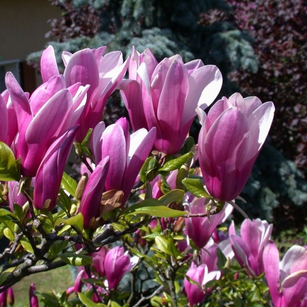 Магнолія Сьюзан (Magnolia Susan) - листяна, квітуча рослина з Магнолієвих. Існує безліч видів цього деревця. Шляхом старань учених сорт Сьюзан набув найширшого поширення серед садівників і просто любителів прекрасного. Форма: Молоді рослини схожі на конусоподібні чагарники. Залежно від умов утримання можуть набувати витягнутої форми, що не вважається відхиленням від норми. З віком набувають округлі обриси. Розмір: При правильному догляді деревце може досягати 3 - 3,5 метрів заввишки. Однак в умовах помірного клімату рідко виростають понад 2 метри. Зростає досить повільно, до 20 сантиметрів приросту на рік. Листяка: Пишна, росте пучками на зрілих гілках, розташовується хаотично. Сформовані листки досить великі по 10 см завдовжки. У теплу пору року темно-зеленого кольору, з похолоданням жовтіють. Коренева система: Добре розвинена. Коріння широко розгалужене, розташовується на поверхні. Рекомендації щодо посадки: Особливу увагу слід приділити ґрунту. На кислому та вологому ґрунті магнолія важче переносить зимівлю. Для відмінного зростання та розвитку в неглибоку посадкову яму потрібно додати добру частку піску та листя. Місце має бути захищеним від протягів та сильного вітру. Для успішного вкорінення краще вибрати південну сторону, а посадку робити навесні. Догляд: Крім багатого і частого поливу цій рослині нічого не потрібно. Мінеральні або комплексні добрива можна періодично використовувати для зміцнення, проте і без підживлення кущ добре цвістиме і розвиватиметься. Молоді саджанці на зиму покриваються подвійним шаром нетканого матеріалу. Дорослі дерева нормально переносять зиму самостійно. Особливості: У жодному разі землю навколо стовбура не можна перекопувати або утоптувати - це дуже шкодить корінням. Прикореневу зону важливо мульчувати щільним шаром листя. Враховуючи те, що крона може досягати 3 - 4 метрів завширшки, деревце повинне рости там, де йому буде достатньо місця. Використання в дизайні: Для домашніх садів і палісадників просто чудовий варіант. Відмінно виглядає як у квітковій клумбі, так і серед фруктових дерев.