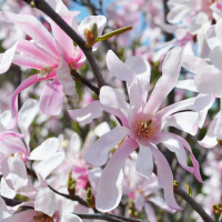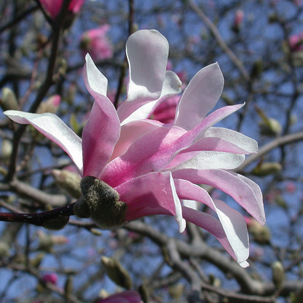 Magnolia Loebneri Leonard Messel - листопадний широкий, вертикальноростаючий, багатоствольний, сильнорозгалужений, великий чагарник або невелике дерево з коротким стовбуром, з віком з плоскоокруглою, асиметричною кроною і мальовничо розгойдуються, злегка звисають. Розмір: 3 - 5 м заввишки, має тенденцію до розростання завширшки. Річний приріст заввишки 25 см, завширшки 20 см. Листя: Розташовані чергово, зворотнояйцеподібні, зелені. Цвітіння: наприкінці квітня, на початку травня на кінцях гілок до розпускання листя у великій кількості, окремі квіти - великі бутони зірчастої форми, діаметром до 14 см, по 11-13 шт. пелюсток, довжиною 5,7-7 см і шириною 0,8 -1,5 см, білого або світло-рожевого кольору, крайні пелюстки мають синьо-червоні або рожево-фіолетові смужки, які здалеку, надають квітам домінантне фіолетово-рожеве забарвлення. всередині пелюстки білі. Квітки спочатку чашечкоподібні, пізніше широко відкриті, дуже ефектні. Місцерозташування та ґрунт: Світлолюбна. Віддає перевагу кислим гумусним, рівномірно свіжим, вологим, дуже пухким і добре дренованим субстратам.