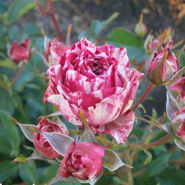 Роза спрей Арроу Фолієс (Arrow Folies) може похвалитися дуже оригінальним строкатим забарвленням квіток. Її пелюстки начебто забарвлені вручну художником-абстракціоністом: вишнево-червоні з білими штрихами та плямами. Невеликі (4-5 см), махрові, келихоподібні квітки зібрані у пишні суцвіття. Незрівнянно виглядає в масивах. Чудовий аромат! Невтомно цвіте протягом усього сезону. Кущ невеликий, розлогий, заввишки 50 см, шириною до 40 см. Стійкість до хвороб хороша, зимостійкий