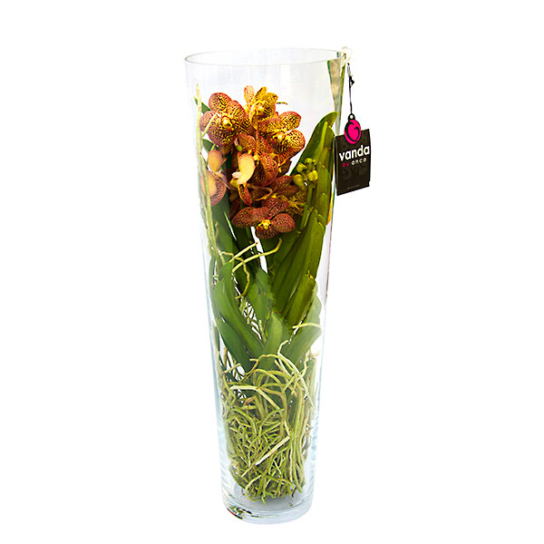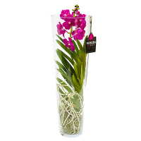 Ванда (Vanda) - це епіфітна рослина сімейства Орхідні, що росте в природі в тропіках Філіппін, Індонезії, Південного Китаю, Індії та Північної Австралії. Відмінною рисою ванда, крім екзотичної краси, є її коріння: потужне, сіро-зеленого кольору, яке може вбирати вологу навіть з атмосфери, чим захищає коріння від зневоднення і від опіків сонячних променів. Стебло орхідеї досягає метра і більше заввишки, тому ванду із задоволенням вирощують як рослину на зрізання. Листя у неї ременеподібне, шкірясте, зелене або злегка сизувате, розташоване чергово. На поникаючих або прямостоячих квітконосах, що ростуть з пазух листя, розквітає від двох до п'ятнадцяти квіток, причому самих квітконосів може бути від однієї до чотирьох. Великі ароматні квіти ванди всіляких забарвлень (помаранчеві, жовті, білі, червоні і навіть сині), зібрані в кистьові суцвіття, відрізняються тим, що розпустившись, вони з кожним днем стають більшими в розмірах і яскравішими. Цвітіння орхідеї триває близько півтора місяця, при правильному догляді вони цвітуть кілька разів на рік. Освітлення: Достатня кількість світла – один з найголовніших факторів успішного росту і цвітіння ванда, але літніх палючих в обідній час сонячних променів слід уникати шляхом легкого притінення. Полив: Полив здійснюється зануренням кореневої системи рослини на 20-30 хвилин у теплу воду. При поливі коріння наповнюється і зеленіє. Занурювати намагаються тільки коріння, листя та коренева шийка від тривалого контакту з водою треба берегти. Якщо вода потрапила до пазух листя, після поливу треба прибрати її за допомогою паперової серветки. Інтервал, який витримується між поливами, залежить від температури у приміщенні та освітленості. У вазах залишати воду не рекомендується, інакше надлишок води призведе до загибелі кореневої системи квітки. Зазвичай рослині дають 20-30 хв на "вгамування спраги", після чого воду, що залишилася, виливають з вазону. Вода для поливу має бути м'якою. Температура: Ванда чудово почувається при стандартній кімнатній температурі, в діапазоні 16 - 18 градусів. Не любить сильних перепадів температур та протягів. Підживлення: Підгодовувати ванду потрібно тоді, коли вона перебуває на стадії активного зростання. Найкраще придбати мінеральні добрива для орхідей і суворо дотримуватися інструкції, що додається. Добриво достатньо вносити раз на 3-4 тижні. Кореневу систему занурюють у воду із добривом на 20-30 хвилин. Якщо дотримуватися перерахованих вище умов догляду, то ванда в скляній вазі подарує вам можливість насолоджуватися красою цвітіння до 3-4 разів на рік.