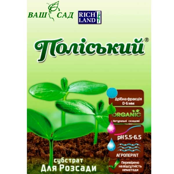 Cубстрат "Поліський" - готова для використання та вирощування спеціальна суміш на основі високоякісних верхових, низинних та перехідних торфів, дрібна фракція яких збільшує площу контакту насіння та коріння з субстратом, що забезпечує краще проростання та вкорінення розсади. Призначений для висіву, пікірування, пасинкування квітів, овочевих та декоративних культур. Об'єм: 5л.