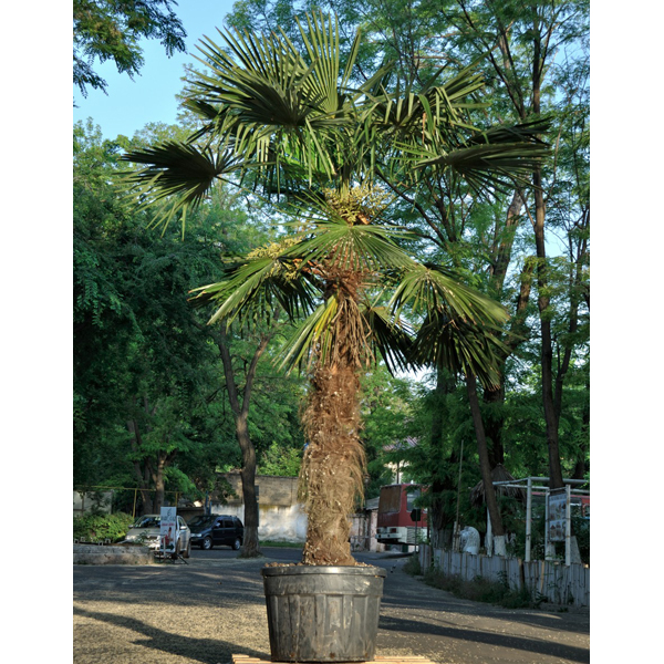 Trachycarpus - потужна пальма з вузлуватим стовбуром і досить жорстким темно-зеленим віяловим листям. Велике віялоподібне листя трахікарпуса складається з довгих гофрованих листочків, що розпускаються з часом. Стовбур рослини поступово розширюється і покривається жорсткими коричневими лусочками від відмерлих листяних черешків. Влітку ця пальма найкраще почувається на вулиці, на свіжому повітрі. Там вона може стояти навіть на сонці. Підживлення повним квітковим добривом проводять кожні 2 тижні. Як субстрат ця пальма віддає перевагу важкому, суглинистому, поживному грунту. Висота штамбу: 180-200 см