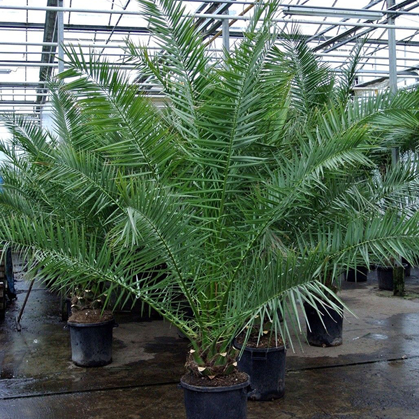 Фінік канарський (Phoenix canariensis), сімейство Пальмові, рід Фінікова пальма - найбільш вдалий вид для вирощування в просторих приміщеннях. Прекрасна прикраса зимового саду. Канарський фінік виростає до 2 м у висоту. Перисті ваї (до 3-5 м) сизо-зеленого кольору розділені на листочки по обидва боки середньої жилки. Листочки жорсткі, прямі та вузькі. Черешки вкриті голкоподібними шпильками. Ваї злегка відігнуті назовні. Освітлення: Рослина віддає перевагу яскравому сонячному світлу, його притіняють тільки в найбільш спекотний годинник.