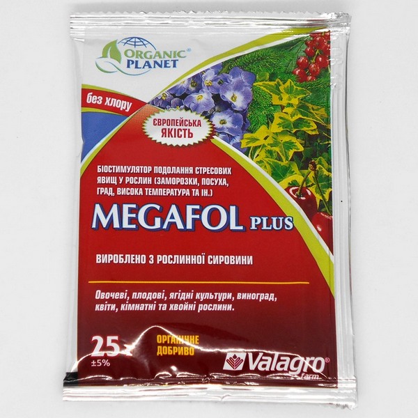 Megafol, 25 г – ефективний біостимулятор нормалізації росту та якісних показників рослин, надає позитивну дію на мікрофлору і безпосередньо на культуру, підвищує стійкість культур до заморозків, посухи, механічних пошкоджень (наприклад, після граду), хімічних опіків, несприятливо високим або низьким температурам.