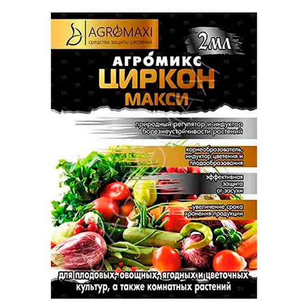 Природний регулятор та індуктор хворобостійкості рослин. Агромікс "Циркон Максі" збільшує схожість насіння (особливо некондиційного), гарантовано вкорінює розсаду, живці, одно- та багаторічники, хвойні, захищає від стресів, знижує фітофтороз картоплі та томатів, пероноспороз огірків, паршу картоплі та яблуні, бактеріоз, фузаріоз, кореневі гнилі, особливо сіру гниль суниці, борошнисту росу троянд і чорної смородини, моніліоз кісточкових, зменшує вдвічі норму отрутохімікатів при сумісному застосуванні.