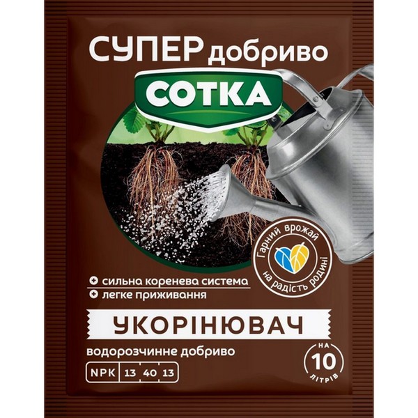 Водорозчинне добриво для професійного та аматорського садівництва, у складі стимулятори укорінення, що активують процеси розвитку кореневої системи. Це суттєво покращує стійкість рослин до стресів, збільшує їх врожайність та сприяє більш ефективному поглинанню поживних речовин із ґрунту. Укорінювач підходить для всіх видів рослин. При посадці і в період активного росту розчинити 20 г на 10 л води. Поливати кожні 10-14 днів 0,5-1 л на рослину (або кілька). під кущ, рясно зволожити.