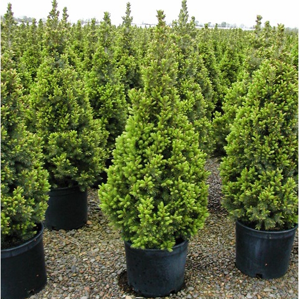 Ялина канадська Коніка - сиза красуня, що відрізняється підвищеною морозостійкістю. Це карликове дерево, у молодому віці використовують для прикраси терас, балконів та зимових садів. У більш зрілому - після 10 років, саджанці висаджують у відкритий ґрунт. Форма: Правильна конусна. Гілки розташовані симетричними ярусами, їхня довжина зменшується до верхівки. Розмір: Карликовий. Висота ялинки Коніка до 10 років рідко перевищує 1 метр. У природних умовах дерево виростає до 3 метрів (іноді вище). Діаметр крони до 1,5 метра. Хвоя: Дуже м'яка, пухнаста. Голки еластичні, загострені до кінця, але приємні на дотик. Хвоя елегантного зеленого кольору. Якщо дерево росте в умовах затінення, то голки набувають жовтого відтінку. Корнева система: Розвинена, неглибока. Навіть дерева, що вкорінилися, можна пересаджувати до віку - 10 років. Рекомендації з посадки: В умовах закритого ґрунту, для посадки Коніки потрібно підготувати вазон, що в 2 рази перевищує розмір кореневої системи. У вазон додається субстрат для хвойних, 1 частина торфу, дерну та пісок. Суміш кожні півроку оновлюється. 1 раз на 3 роки саджанець пересідає в нову ємність. При висадці у відкритий ґрунт для Коніки готується посадкова лунка з розміром, що в 1,5 разів перевищує кореневу систему. Догляд: Для захисту ніжної хвої забезпечуються регулярні обприскування інстекцидами та фунгіцидами. Щосезону кореневим способом вносяться мінеральні добрива пролонгованого типу дії. Полив має бути помірним, у міру висихання субстрату. Особливості: Це невибагливе дерево з добрими показниками витривалості. Ялина відмінно переносить затінення та перепади температури, але при висадці у відкритий ґрунт необхідна акліматизація. Саджанці мають фітонцидні якості. Використання в дизайні: Карликові ялинки в горщиках часто прикрашають новорічні столи, кімнатні різдвяні композиції та дворовий ландшафт. Професійні дизайнери доповнюють Конікою альпійські гірки, розарії, квіткові клумби. Рідше – живі огорожі.