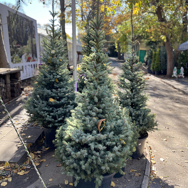 Хвоя розташована густо, колюча, довжиною 10 - 12 мм, сріблясто-блакитного забарвлення. На освітлених ділянках зберігає свою декоративність протягом усієї вегетації, в тіні може змінити колір на темно-зелений. Плід - овальна шишка розмірів 8-9 см, коричневого відтінку.
