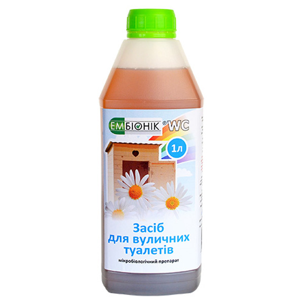 ЕМБІОНІК®-WC - Засіб для вуличних туалетів та вигрібних ям. Властивості: -Відновлює дренажну систему, -запобігає замулюванню дна, -розкладає органічні відкладення, -Усуває неприємний запах, -Сприяє загибелі патогенної мікрофлори. Опис: Живі мікроорганізми, що входять до складу препарату, ефективно розкладають всю тверду органіку та переробляють органічні відкладення в органічне екологічно чисте добриво, яке можна використовувати на ділянці. Застосування препарату дозволяє швидко (за 2-3 дні) усунути неприємний запах у септиці та зливній ямі. Цей процес на 100% біологічний та безпечний. Використання препарату вимагає спеціальних знань, т.к. рідкий ЕМ-препарат повністю готовий до застосування. Не токсичний, безпечний для людини та тварин. При цьому обробка септика або зливної ями вигідна для власників дач, котеджів та присадибних ділянок, тому що в результаті застосування препарату споживач отримує подвійний ефект – підтримується гігієна та екологія, плюс виходить якісне добриво для саду та городу. Використання препарату запобігає замулюванню дна зливної ями та покращує загальну роботу дренажної системи, очищає труби та каналізацію від наростів, жирових відкладень та залишків їжі, знищує патогенну мікрофлору. Склад: Молочнокислі, целюлозоруйнівні, фототрофні бактерії, дріжджі, продукти життєдіяльності мікроорганізмів.