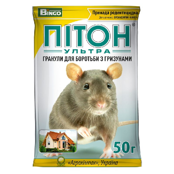 Принада проти всіх видів гризунів: пацюків, мишей, полівок та ін. Застосовується на територіях населених пунктів, включаючи житлові приміщення, харчові, дитячі та лікувальні об’єкти (в недоступних для дітей місцях). Препарат економічний та зручний у використанні. Гризуни, поїдаючи принаду, отримують смертельну дозу отрути та починають гинути через 2-4 доби. Остаточний ефект настає через 2 тижні. ПІТОН УЛЬТРА привабливий для гризунів завдяки харчовим складовим. Придатний до використання як в сухих, так і в вологих приміщеннях (каналізаційні мережі, підвали, льохи, підземні споруди).