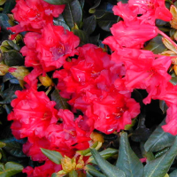 Rhododendron repens "Baden-Baden" Зовнішній вигляд: чагарник з шорсткою корою. Квіти яскраво-червоного кольору, період цвітіння з 4 тижня квітня до 1 тижня червня, форма куща: широко-округла, закрита, до 50 см заввишки і 120 см завширшки, абсолютно зимостійка рослина, листя темно-зелені кручені. Діаметр крони 40 см. Висота рослини 30 см.