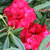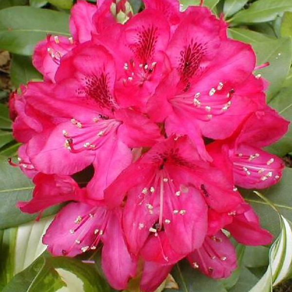 - рододендрон з великими, рубіново-червоними з чорною плямою та кропом на верхньому пелюсті квітами. Листя велике, еліпсоподібне, шкірясте, темно-зелене зверху і сіре знизу. Дорослий чагарник досягає близько 2 - 2,5 м у висоту та ширину. До цієї чудової рослини не залишиться байдужим жоден квітникар. Завдяки надзвичайно пишним оксамитовим квіткам, навіть наявність одного такого кущика, перетворить будь-який сад. Квіткова клумба з рододендронів буде виглядати повітряно і ніжно. Особливості посадки: Оскільки ця рослина любить півтінь, їй буде дуже комфортно під кроною дерев або високих чагарників. Грунт повинен бути з помірною кислотністю або взагалі слаболужний. Садити його краще в лунку або широку ямку, оскільки коріння цієї квітки має властивість розростатися. Головне стежити, щоб коренева шийка не йшла в ґрунт, так квітка не візьметься. У грунт можна додати перегною, якщо земля суха і неродюча, якщо вона волога і свіжа досить насипати трохи піску для утворення кисневих озер. Добрива: Дорослу рослину достатньо підгодовувати раз на місяць, для цього підійде розбавлене мінеральне добрива, краще суперфосфат у легкій концентрації. Також дуже сприятливо позначаються органічні речовини, які розведені у воді, перед поливом їх обов'язково добре відстояти. Молодим кущам тих же мінеральних та органічних складів потрібно вдвічі більше. Догляд: Кущі, що добре розрослися, обов'язково потрібно підрізати, для цього, гілки діаметром до 4 см. потрібно зрізати, а місце зрізу обробити масляною фарбою, для профілактики інфекцій. Для щорічного пишного цвітіння, старі суцвіття теж потрібно видаляти, то рослина замість однієї сухої нирки дасть 2-3 нові. Морозостійкість: Висока. Добре розвинені, кущі, що обрізають, зимують без додаткової допомоги при температурі до -30 градусів, завдяки чому вистоюють навіть суворі зими. Нещодавно посаджені кущики можна накрити сосновою хвоєю чи лапником. Перед зимівлею, до перших морозів рослину потрібно рясно полити. Розмноження: Насіння потрібно висадити в глибокий контейнер і накрити плівкою, для парникового ефекту, сіянці, що підросли, краще пересадити в теплицю до наступного року. У відкритий грунт можна садити саджанці, що добре сформувалися.