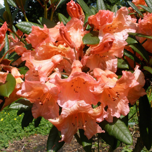 - рододендрон з великими помаранчевими квітами. Вічнозелене листя овальне, шкірясте, темно-зелене влітку і бронзове взимку. Дорослий чагарник досягає близько 1,5 - 2 м у висоту та ширину. До цієї чудової рослини не залишиться байдужим жоден квітникар. Завдяки надзвичайно пишним оксамитовим квіткам, навіть наявність одного такого кущика, перетворить будь-який сад. Квіткова клумба з рододендронів буде виглядати повітряно і ніжно. Особливості посадки: Оскільки ця рослина любить півтінь, їй буде дуже комфортно під кроною дерев або високих чагарників. Грунт повинен бути з помірною кислотністю або взагалі слаболужний. Садити його краще в лунку або широку ямку, оскільки коріння цієї квітки має властивість розростатися. Головне стежити, щоб коренева шийка не йшла в ґрунт, так квітка не візьметься. У грунт можна додати перегною, якщо земля суха і неродюча, якщо вона волога і свіжа досить насипати трохи піску для утворення кисневих озер. Добрива: Дорослу рослину достатньо підгодовувати раз на місяць, для цього підійде розбавлене мінеральне добрива, краще суперфосфат у легкій концентрації. Також дуже сприятливо позначаються органічні речовини, які розведені у воді, перед поливом їх обов'язково добре відстояти. Молодим кущам тих же мінеральних та органічних складів потрібно вдвічі більше. Догляд: Кущі, що добре розрослися, обов'язково потрібно підрізати, для цього, гілки діаметром до 4 см. потрібно зрізати, а місце зрізу обробити масляною фарбою, для профілактики інфекцій. Для щорічного пишного цвітіння, старі суцвіття теж потрібно видаляти, то рослина замість однієї сухої нирки дасть 2-3 нові. Морозостійкість: Висока. Добре розвинені, кущі, що обрізають, зимують без додаткової допомоги при температурі до -30 градусів, завдяки чому вистоюють навіть суворі зими. Нещодавно посаджені кущики можна накрити сосновою хвоєю чи лапником. Перед зимівлею, до перших морозів рослину потрібно рясно полити. Розмноження: Насіння потрібно висадити в глибокий контейнер і накрити плівкою, для парникового ефекту, сіянці, що підросли, краще пересадити в теплицю до наступного року. У відкритий грунт можна садити саджанці, що добре сформувалися.