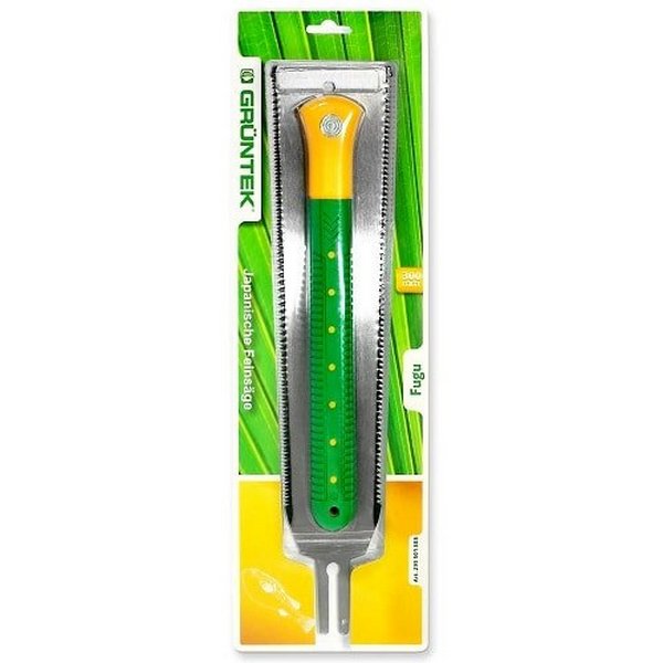 Gruntek Fugu – пила садова з двостороннім лезом для ефективного чищення чагарників, пиляння гілок, розпилу ДСП та пластику. Зручна пилка японського типу для роботи не тільки в саду, а й у майстерні чи гаражі. Лезо пилки виготовлено з міцної високовуглецевої сталі 65MN, яка забезпечує тривалий термін експлуатації. Потрійне імпульсне заточування зубів дозволяє швидко працювати з матеріалом. Крок зубів з одного боку 7 зуб/дюйм з іншого боку 10 зуб/дюйм, що дозволяють ефективно справлятися з різним типом матеріалу, забезпечуючи грубий різ. Пластикова рукоятка з ребристою поверхнею забезпечує надійне захоплення та безпечну роботу з інструментом. Рукоятка знімається для компактного зберігання пилки. Леза захищені спеціальними чохлами, що забезпечує безпеку в неробочому стані, а також запобігає затупленню зубів. Загальні характеристики: Загальна довжина - 400мм Довжина леза - 300мм Товщина леза - 0,67мм, Товщина різальної частини - 1,2 мм