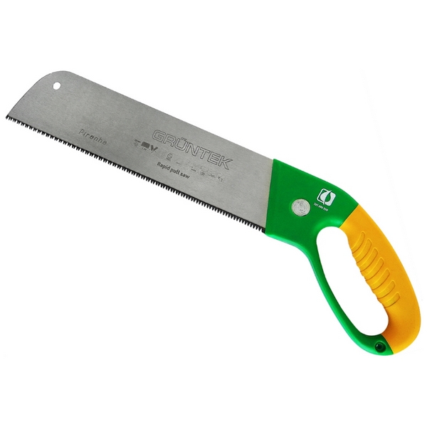 Gruntek Piranha - садова пилка для спилювання гілок, невеликих дерев та іншої рослинності в саду. Пила обладнана змінними лезами, які виготовлені із карбонової загартованої сталі. Одне з лез з кроком 8 зубів на дюйм – призначене для універсальної роботи з суччям, дошками, не великими стовбурами та ін. Обидва леза мають широку основу та потрійне заточування зубів з термічною обробкою. Зручна вигнута рукоятка D-подібної форми забезпечує надійне захоплення, а завдяки рейкам на ручці рука не ковзає під час роботи. Зміна лез відбувається швидко за допомогою натискання 1-ї кнопки на ручці. Пилу зручно зберігати завдяки отвору на лезі, за яке її можна повісити у гаражі чи майстерні. Загальні характеристики: Довжина леза - 350мм Вага - 900гр