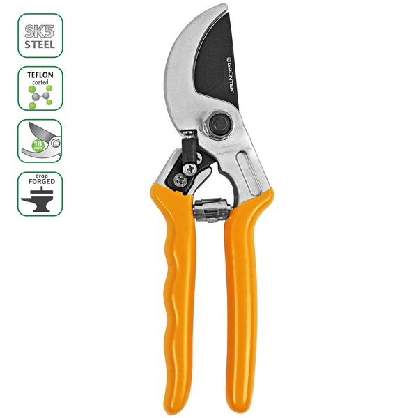Секатор Gruntek Rabe створений для акуратного обрізання зелених гілок, кущів, лози, молодих пагонів та квітів. Леза секатора виконані з високовуглецевої сталі SK5 для точного різання живих гілок. Тефлонове покриття лез запобігає налипанню соку, гілок, листя для зручної та якісної роботи. Обладнаний фіксатором лез у складеному вигляді для безпечного зберігання інструменту. Також на рукоятці є спеціальний отвір, щоб повісити секатор в гаражі або майстерні. На рукоятці знаходиться ребриста накладка для кращого захоплення інструменту, завдяки чому секатор Gruntek Rabe не ковзає в руці під час роботи. Рекомендації до використання: зберігати секатор у сухому місці та після застосування змащувати машинним маслом. Довжина інструменту - 20 см Діаметр різання - 8 - 20 мм Вага - 200 гр