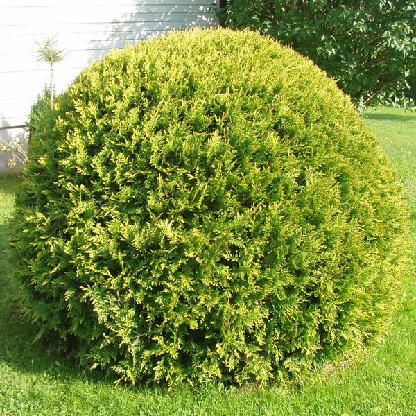 Туя західна Голден Глоб - вічнозелений кулеподібний кущ жовтого кольору, що повільно росте, досягає у віці 10 років близько 80 см завширшки і висоту. Прекрасна карликова туя, якою знайдеться місце у кожному, без винятку, саду. Невелика жовта кулька пожвавлює ландшафт саду навіть у похмурі осінні дні. Росте повільно. Щорічний приріст приблизно 8-10 см. Висота та діаметр дорослої рослини 1-1,2 м. Хвоя: хвоя золотисто-жовтого кольору. Жовті кінчики пагонів, яким дістається багато сонця, повністю покривають рослину, хоча усередині кулі хвоя яскраво-зелена. Восени Туя західна Голден Глоу набуває мідного відтінку, а навесні знову стає золотистою. Місцерозташування: своє золоте забарвлення Туя Голден Глоб набуває тільки на сонячних ділянках або в півтіні. До ґрунтів невибаглива, добре росте на всіх родючих, свіжих та вологих ґрунтах, від кислих до лужних. Догляд: Навесні рекомендується вносити фосфоровмісні та азотовмісні мінеральні добрива. Щороку навесні проводиться видалення сухих пагонів. У живоплоті зістригається трохи більше 1/3 довжини втечі. Формування крони за потребою. Доросла Thuja occidentalis Golden Globe зимостійка і не вимагає укриття, а молоду рослину в першу зиму після посадки рекомендують обмотують не дуже щільною мішковиною, щоб уберегти хвою від зимових та весняних сонячних опіків. Використання: Ідеально підходить для невеликих садів. Її можна висаджувати як солітер на газоні, використовувати для невисокої живоплоту, що вільно росте, поєднувати з іншими красивоквітучими рослинами і рослинами з контрастним листям в міксбордерах. Рядові невисокі строкаті посадки вздовж фасадів адміністративних та офісних будівель, торгових центрів. Хвойна вічнозелена живоплот жовтого кольору, стрижені бордюри вздовж садових доріжок, а також кольорові композиції.