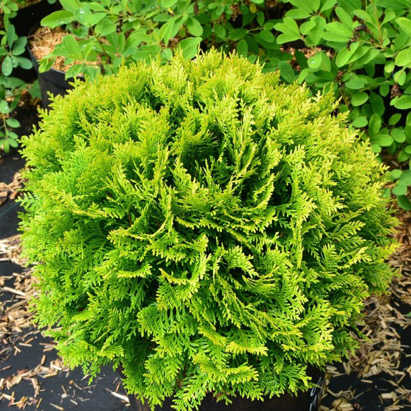 Туя західна Міріам - куляста туя жовто-зеленого кольору, з вертикально розташованою хвоєю, яка змінює забарвлення на бронзову зиму, а навесні знову стає соковито-зеленою з жовтими відтінками. Сорт виведений з Thuja occidentalis Danica, перейнявши від неї найкращі декоративні властивості. Добре росте у межах міста, підходить для вирощування на всій території України. Висота і діаметр не більше 0,8 м. Повільно зростаючий вигляд, річний приріст становить близько 5-10 см. Місцерозташування та грунт: віддає перевагу сонячним місцям на ділянці, або легкій півтіні. У тіні хвоя втрачає свої декоративні властивості, тьмяніє, а крона стає пухкою. Любить свіжі, помірковано вологі умови. До ґрунтів невибаглива, але найкраще росте і розвивається на родючих, свіжих, помірно вологих, кислих ґрунтах. Використання: Туя західна Міріам підходить для використання поодиноко та групами. Для створення строкатих живоплотів та бордюрів, відмінно піддається стрижці та фігурному формуванню під кулю. Часто використовується в одиночних та групових посадках у різних колірних композиціях. Застосовується в альпінаріях, рокаріях, міксбордерах для створення контрастних композицій, а також у контейнерах.