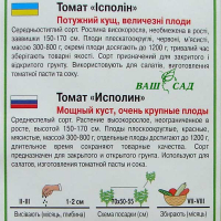 Детальний опис див. на другому фото. Потужний кущ, дуже великі плоди Середньостиглий сорт. Рослина індетермінантна, необмежена в рості, висотою 150 - 170 см. Плоди плоскоокруглі, червоні, м'ясисті, масою 300 - 800 г, окремі плоди досягають до 1200 г, тривалий час зберігають товарні якості. Сорт призначений для закритого та відкритого ґрунту. Використовують для салатів, томатної пасти та соку.