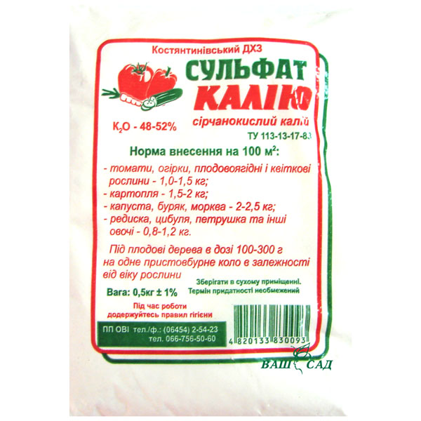Добрива сульфат калію або сірчанокислий калій застосовується для підживлення рослин закритого ґрунту (тепличних або кімнатних культур), відкритого та плодових дерев та чагарників. У його складі немає хлору та інших агресивних сполук, які можуть негативно вплинути на листя або незміцнілу корінну систему. Вигляд: Мінеральне. Класифікація: Водорозчинне, гранульоване. Тип: Універсальне. Призначення: Сульфат калію використовується для підготовки ґрунту до зимівлі. Калій допомагає рослинам перенести посухи, сильні морози та різкі перепади температур, знижує вплив стресів та регулює кислотність ґрунту. Його рекомендується застосовувати для покращення смакових та якісних показників плодів. При регулярному використанні забезпечується підвищення врожаю, забезпечується профілактика різних грибкових захворювань (зокрема сіра гнилизна). Застосування: Сульфат калію вноситься кореневим та листяним способом. При кореневому використанні добриво можна розводити у воді при температурі 20 градусів або з'єднувати з ґрунтом у сухому вигляді. Для підживлення розсади на квадратний метр береться не менше 20 г сірчанокислого калію. При поливі витримується концентрація: 40 г калію на 10 літрів мінеральної води. Для зрошення листя кількість мінерального добрива зменшується до 30 грам на 10 літрів. Для обприскування потрібно вибирати вечірній час – коли сонячна активність мінімальна. Склад: Сульфат калію, незначна кількість додаткових домішок. Вага: 0,5 кг. Країна: Україна.