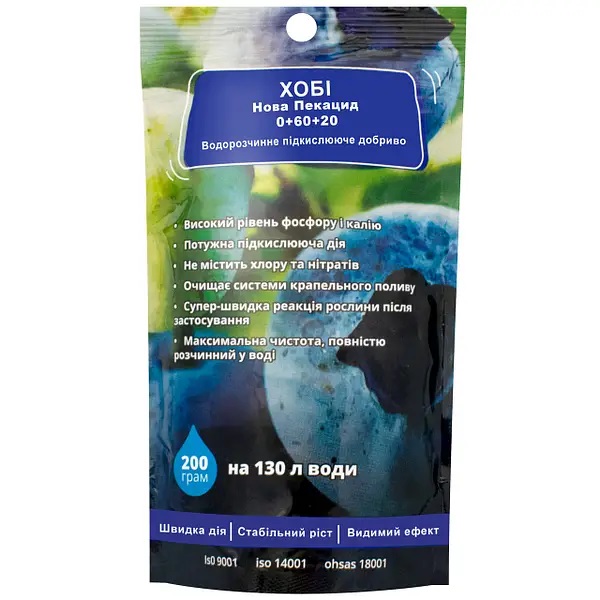 Концентроване водорозчинне удобрення Хобі Нова Пекацид застосовується для швидкого підживлення різних видів рослин для усунення дефіциту макроелементів фосфору та калію. Добриво активізує обмін речовин у рослинних клітинах, підвищує фотосинтез та стійкість рослин до хвороб та шкідників. Крім того, фосфор і калій благотворно впливають на формування насіння і плодів, сприяючи поліпшенню їх якості та підвищенню врожайності. Фосфор потрібний для розвитку кореневої системи, зміцнення стебел рослин і підвищення їх витривалості до стресів. Це важливий елемент для синтезу білків, ферментів та фосфоліпідів, а також для нормалізації енергетичних процесів у рослинах. Калій стимулює процеси цвітіння й плодоношення, підвищує якість і збереження врожаю. Фосфорно-калійна підживлення має сильну підкислювальну дію і під час використання ефективно знижує pH ґрунту, сприяючи кращому розвитку кислолюбних культур, таких як картопля, чорниця, рододендрони, азалії, гортензії, вересу та багато інших.