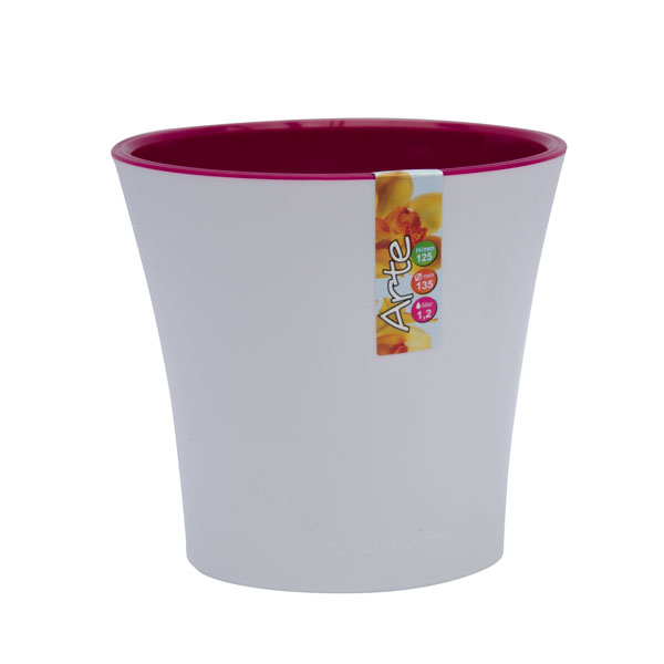 Інноваційні вазони для квітів серії «Arte» від компанії Сантіно мають вбудовану дренажну систему. Дренажна система збирає надлишки води при поливі і потім дозовано, при необхідності, підживлює кореневу систему рослини. Також дренажна система захищає коріння рослин від загнивання. Крім заводської дренажної системи, на дно вазону рекомендується насипати шар керамзиту, товщиною 2-3 см. Горщики Арте виконані в сучасному, стильному дизайні і стануть елегантним доповненням будь-якого інтер'єру. Виготовлені з високоякісного пластику, ударостійкі, не змінюють колір під впливом сонячних променів. Головна перевага цих горщиків - подвійне дно. Верхній горщик має дренажні отвори, завдяки чому коріння рослин не загниватиме від надмірного перезволоження, нижній горщик несе функцію піддону. Горщик Арте перетворить інтер'єр вашої квартири чи будинку. Комплект: - декоративний горщик - вкладка *Кольори можуть незначно відрізнятися в залежності від налаштувань вашого монітора. Колір: Білий з пурпуровим Висота: 10 см Діаметр: 11 см